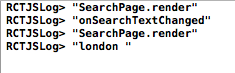 onSearchTextChanged(event) { console.log('onSearchTextChanged'); this.setState({ searchString: event.nativeEvent.text }); console.log(this.state.searchString);}上面的代码从 events 中取出了 text 属性的值,并用于更新组件的状态。这里面也添加了一些有用的调试代码。