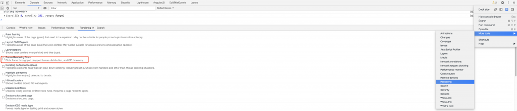 chrome现在有一个高大上的fps观测工具,你可以不用再去分析performance面板的跑分了。